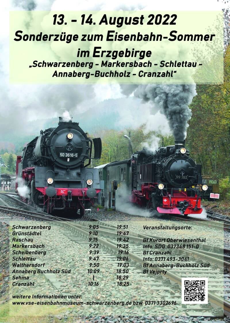 Am Wochenende des 13./14.08.2022 finden im Rahmen der Veranstaltung "Eisenbahnsommer im Erzgebirge" auch unsererseits Sonderfahrten (voraussichtlich dieselbespannt) statt.