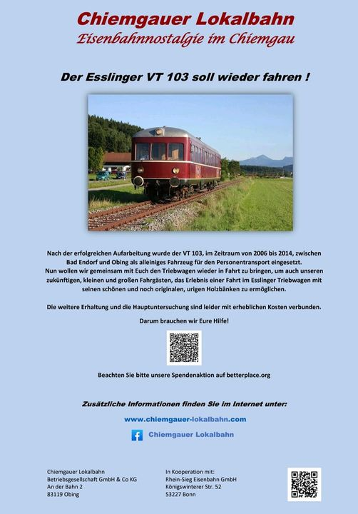 Um unser ehrgeiziges Ziel realisieren zu können sucht die Chiemgauer Lokalbahn noch finanzielle Unterstützung.