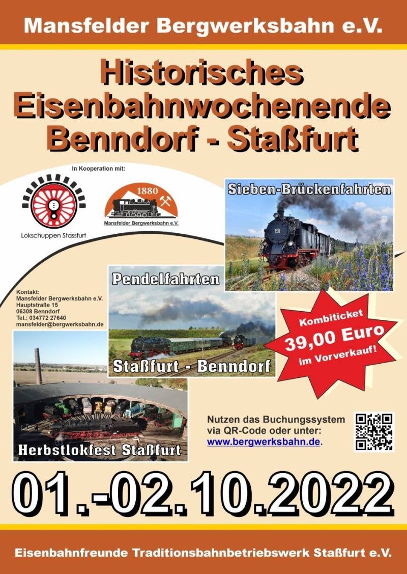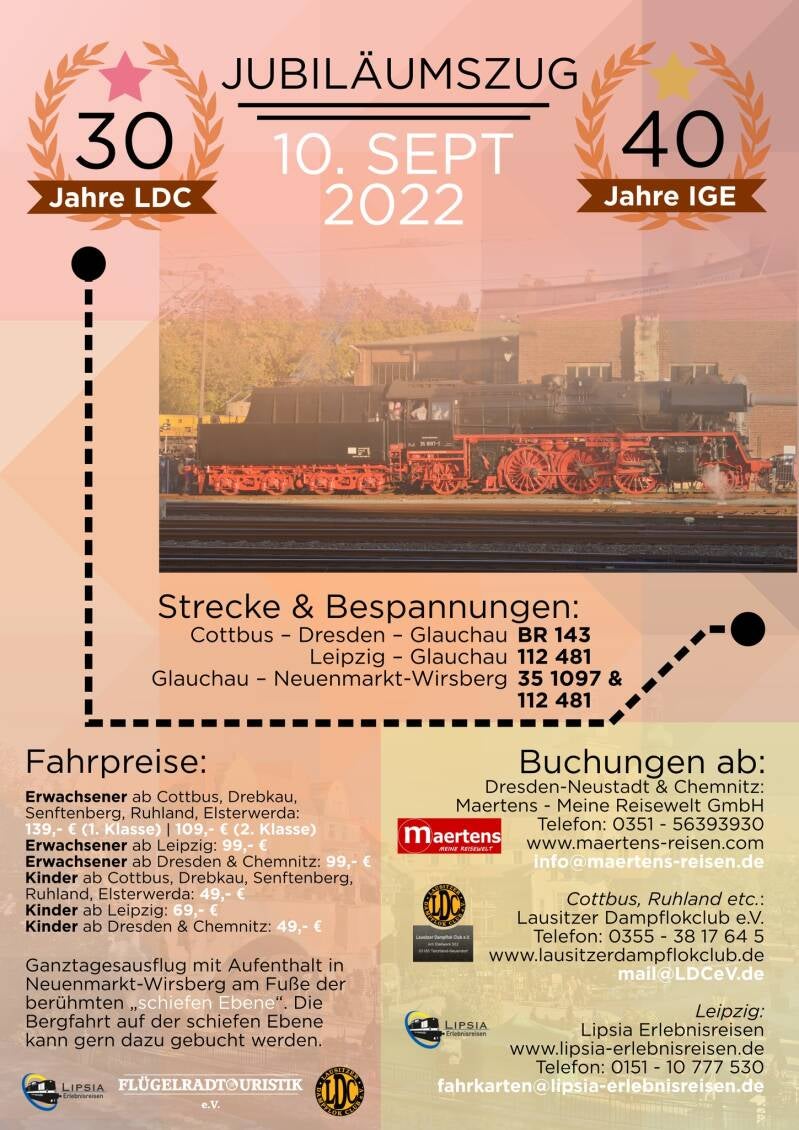 Aber auch so wird es wieder ein umfangreiches Sonderzugprogramm geben: Am Freitag, 23.09., die 35 1097 und 50 3648 auf der Tharandter- und Klotzscher Rampe, am 24.09. der abendliche Nachtschnellzug nach Cottbus mit 03 2155 und am 25.09. morgens 01 2066 und 52 8141 parallel auf der Tharandter Rampe!